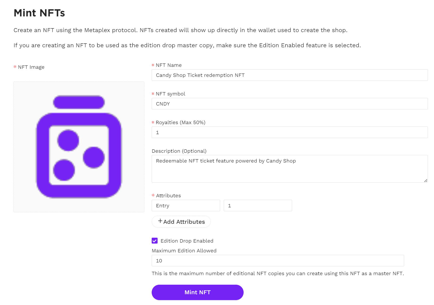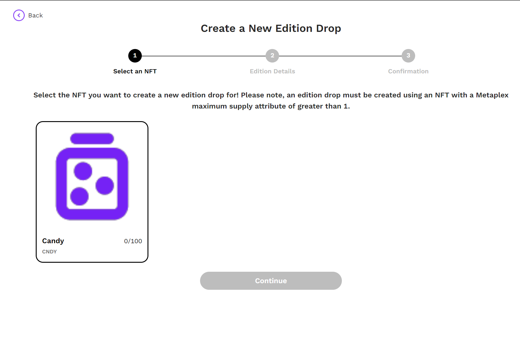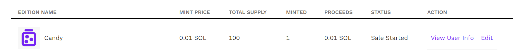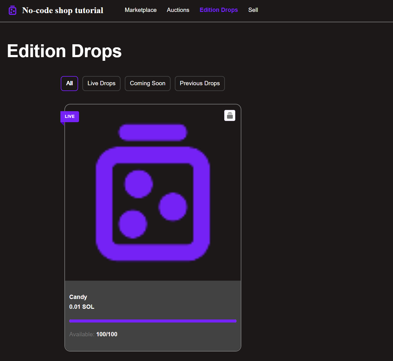 - Head over to your CandyShop NFT storefront and go to the Edition Drops tab. Click on your Edtion Drops sale icon to mint.
