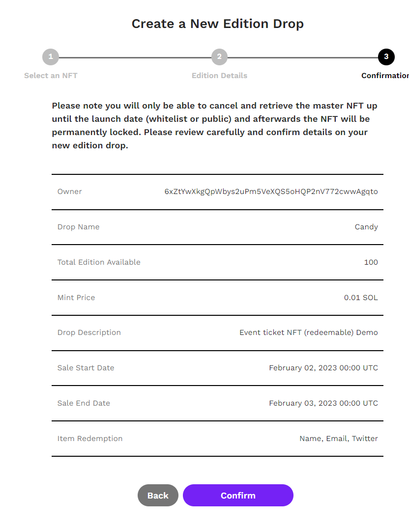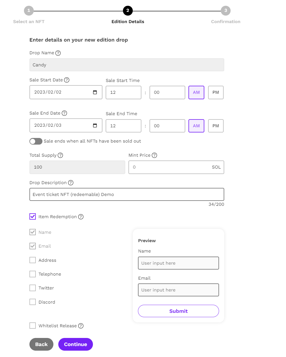 3. Configure the duration of the sale, and set the mint price for each mint. Check the Item Redemption box and check the desired user info to be required. Click Continue to move to the summary page.